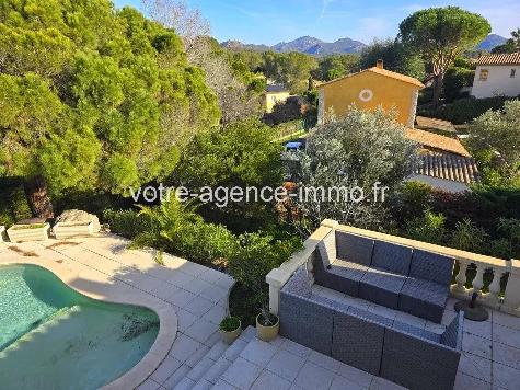 930000 € SURFACE : 121.18 m2EXCLUSIVITE : SAINT RAPHAEL, secteur huppé et recherché de VALESCURE / LES VEYSSIERES, dans un LOTISSEMENT RESIDENTIEL, MODERNE et un ECRIN DE VERDURE offrant une vue sublime sur le MASSIF de l'ESTEREL, MAGNIFIQUE VILLA INDIVIDUELLE de STYLE PROVENCAL de 2002, en SITUATION DOMINANTE, sur 2 niveaux, de 5/6 PIECES pour 121,18m² Loi Carrez (surface totale de 151,36m²) et dans un ETAT EXCEPTIONNEL. TERRAIN de 1.169m² comprenant plusieurs terrasses et un BEAU JARDIN MEDITERRANNEEN, une PISCINE, un GRAND GARAGE et un nombre considérable de stationnements intérieurs et extérieurs. CALME, LUMINEUSE, sans vis-à-vis et en retrait des voies de circulation. Elle se compose au rez-de-jardin d'une entrée (10,55m²), d'un salon (11,16m²), d'un BEAU et GRAND séjour dans son prolongement (33,70m²) avec 3 expositions offrant le soleil du matin au soir et un accès sur la PISCINE, d'une cuisine aménagée et équipée (13,53m²) ouverte sur le salon et comprenant un espace cellier / buanderie attenant (4,23m²), une salle de douche avec wc (4,07m²) ainsi qu'un bureau (7,80m²) donnant accès à un GRAND GARAGE (18,50m²), complètent sa distribution. A l'étage, un dégagement répartit 3 chambres (9,57m², 10,60m² et 13m²), chacune ayant une orientation et une vue différente des plus agréables, une salle de bains (5m²) ainsi qu'un wc séparé (1,54m²). NOMBREUSES PRESTATIONS parmi lesquelles : porte blindée, double vitrage toutes fenêtres, baie vitrée coulissante dans le séjour et sur la piscine, volets roulants électriques (séjour et garage), cheminée (insert), système de vidéosurveillance avec abonnement, nombreux placards de rangement, vidéophone, vide sanitaire et tout-à-l'égout... Concernant les COMMODITES : Arrêt de bus à 500m (lignes 6 et 7), commerces à 15mns à pied ou 2mns de voiture, Golf et tennis pour les plus sportifs à 5mns et sentiers de randonnées accessibles facilement du lotissement, autoroute à 20mns, AGAY et ses plages à 7mns, Saint Raphael à 11mns, Fréjus à 13mns, Cannes à 45mns, Saint Tropez à 60mns, Nice et son aéroport à 70mns... Le charme de la Provence dans un environnement haut de gamme et un cadre naturel. Une maison aux nombreuses prestations offrant le "coup de coeur" et pouvant satisfaire un achat en résidence principale comme en résidence secondaire. - Nombre de lots de copropriété : 449 lots. - Dernière quote-part annuelle de charges (2024 / 2025) : 442,08 €. - DPE : 185 Kwh/m²/an (D) - GES : 5 kg.co2/m²/an (A) - Consommation annuelle entre 1.737 € et 2.349 € (années de références : 2021 à 2023). - Les informations sur les risques auxquels ce bien est exposé sont disponibles sur le site Géorisques : georisques.gouv.fr.